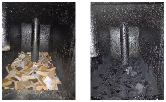 Due to the heating rate of the fuel particles (biomass), two main pyrolysis mechanisms can be distinguished, i.e., slow and fast pyrolysis. Carbonization is a slow pyrolysis process. The biomass is heated slowly over a longer period of time, with no access to oxygen and a relatively low temperature of about 400 °C. The dominant product is char [21,22]. According to [21], when the wood temperature increases from 147 to 167 °C, transient moisture is released. In the temperature range from 247 to 267 °C, water chemically bound in the cellulose structure, CO2, CO, small amounts of condensing vapours of acetic acid, methanol, and wood tar are released. Above 267–277 °C, methanol, acetic acid, acetone, lighter hydrocarbons, wood tar, and small amounts of hydrogen are strongly released, and the amount of CO2 and CO released decreases. Above 397°, quasi-graphite layers are formed and the transformation of wood into charcoal (char) is completed. In turn, the goal of fast pyrolysis is the maximum yield of liquid or gaseous products. The heating rate should be from 1 to 10 °C/min and the temperature should be lower than 650 °C in order to obtain bio-oil, or higher than 1000 °C if the dominant product is to be gas [22].