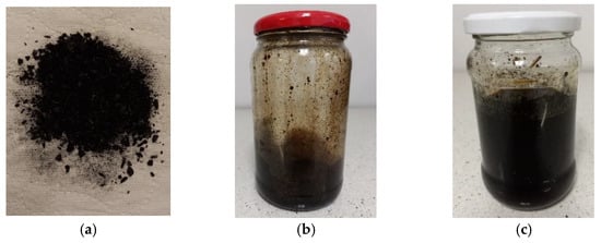 Figure 3 shows examples of pyrolysis products. As a result of the low-temperature pyrolysis process, three products were obtained, i.e., char, pyrolysis oil, and pyrolysis gas. After 24 h from the end of the process, the separation of the oil fraction into oil and contaminated water was observed.