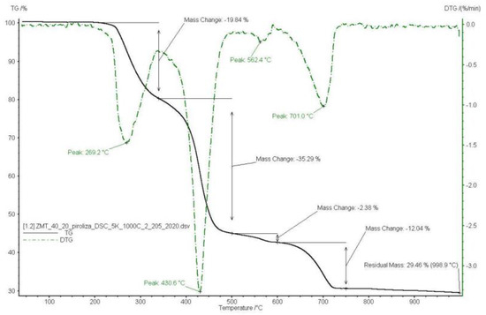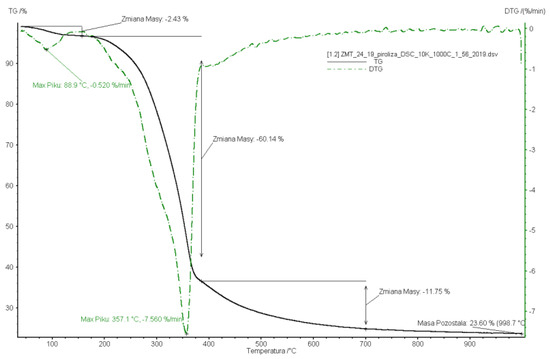 The first research step was to determine the parameters of the pyrolysis process, including temperature. For this purpose, TG/DTG analysis was used, which is designed for the waste discussed in this work. Figure 4 and Figure 5 show an example thermogravimetric analysis for two samples: waste floor panels made of HDF fibreboard and waste floor panels made of vinyl board [4,11]. A similar order of magnitude of mass loss was recorded in TG/DTG tests and in tests performed on a laboratory scale. The greatest weight loss was found for HDF panels in the second stage of the pyrolysis of the material, from approximately 160 to 400 °C. For the vinyl panel, the largest loss was also recorded in the second stage, from approximately 350 to 450 °C.