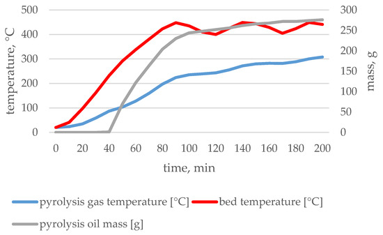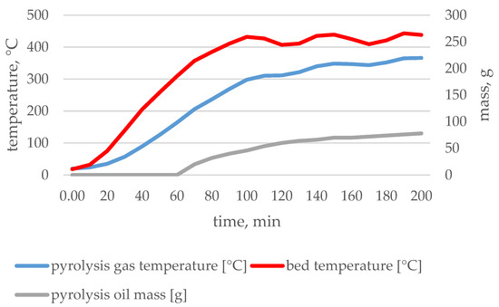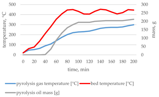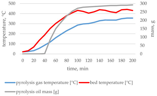 A single pyrolysis process carried out in laboratory conditions lasted 200 min. It was found that regardless of the pyrolyzed material used in the apparatus, the maximum assumed temperature was (425 °C) achieved between 80 and 100 min of the experiment. For the vinyl panel, the maximum assumed temperature was achieved in the 100th minute of the experiment. Further temperature fluctuations result from the adopted heating control process of the device (following and tracking system). The temperature difference between the bed and the gas at the chamber outlet was in the order of 100–150 °C for the five cases considered, with the exception of trial 6—for vinyl panels the difference was approximately 60 °C. The onset of oil condensation was recorded for five biomass-based trials at 40 min of the experiment. However, for the vinyl record, the beginning of oil condensation took place in the 60th minute of the experiment.