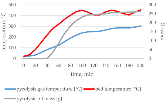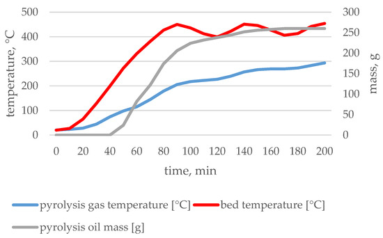 During the experiment, the weight of the samples used, the products obtained, the bed temperature, the temperature of the pyrolysis gas, and the process duration were measured. The results are presented in Figure 6, Figure 7, Figure 8, Figure 9, Figure 10 and Figure 11 and in Table 1.