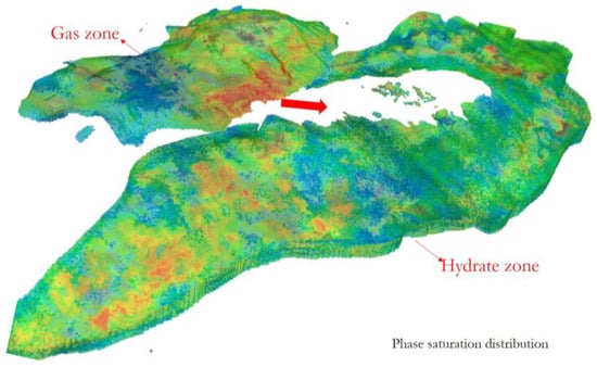 Figure 2 shows the hydrate-gas distribution characteristics of the target hydrate system. The hydrate system is controlled by a high geothermal gradient gas chimney. The hydrate and gas are distributed in the same layer, with the gas in the middle and the hydrate distributed around. The maximum saturation of free gas is up to 75%, and that of the hydrate is 87%. The greater the depth, the larger the extension area of free gas. As shown in Figure 3, there is a large lateral transition zone of hydrate gas in the system. The whole sediment is characterized by strong horizontal heterogeneity, which can be mainly divided into three parts: ① Pure hydrate zone. It is like a type 3 hydrate reservoir. ② Transition zone of hydrate and free gas. It is similar to a type 1 hydrate reservoir, where free gas underlies the hydrate. There is a free water zone under the transition zone in the western part of this system. ③ Free gas reservoir. There is a relatively high-temperature gas reservoir in the center of this system. The strong horizontal heterogeneity also increases the difficulty of well selection during extraction.