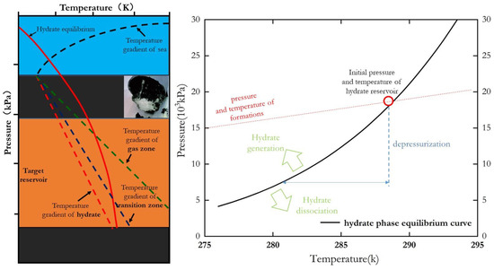 The characteristic of the geothermal gradient and hydrate equilibrium curve in the target system.