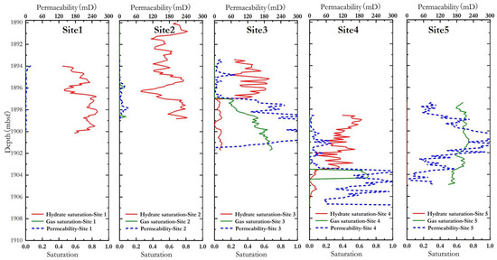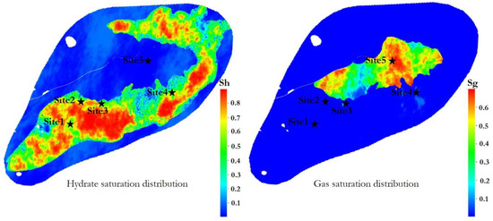As shown in Figure 5 and Figure 6, the position of the well mainly targets the zone above three different areas, namely the hydrate zone, transition zone, and gas reservoir. The first position in the hydrate zone is Site 1, the center of the highly-saturated hydrate area. The second is Site 2, the boundary of the hydrate zone, which is near the transition zone. The Site 1 depth is at 1894–1900 m, and the Site 2 depth is at 1890–1899 m. For the transition zone, the free water zone is considered separately. Site 3 and Site 4 are established, respectively. The Site 3 depth is at 1893.4–1901.7 m, and it contains a 3.5 m thick hydrate layer and a 4.8 m thick gas layer. The Site 4 depth is 1898.5–1906.9 m, and it includes a 5 m thick hydrate layer, a 1.2 m thick gas layer, and a 2.2 m thick free water layer. Site 5, which is located in the middle of the gas reservoir, is at 1897.4–1904.9 m. Five representative single vertical well positions were initially selected for production capacity simulation.
