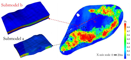 In order to speed up the simulation and reduce the arithmetic pressure, two sub-models were extracted for different sites. The first sub-model, a, is in the hydrate zone, with Site 1 as the center (Figure 7). The whole sub-model a grid is 156 × 101 × 116. The sub-model has a transverse and longitudinal span of 1.56 km and 1.0 km, respectively. The second sub-model, b, is larger and bounded by a fault in the north, including the central gas zone, the transition zone, and part of the hydrate zone. The whole sub-model b, with a grid number of 219 × 97 × 141, spans 2.19 km and 1 km. Sites 2–5 are included in the sub-model b.