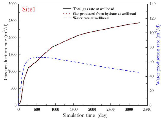 Variation of total gas water at the wellhead, gas produced from hydrate at the wellhead, and water production with time at Site 1.