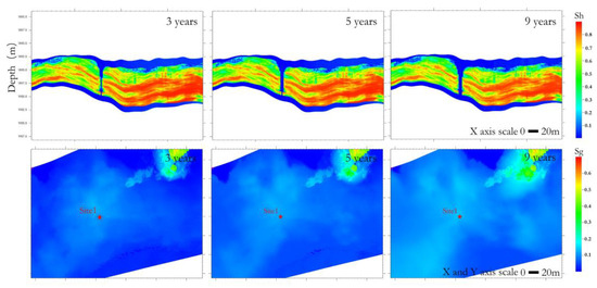 Site 1 is a typical Type 3 hydrate deposit. In the production capacity prediction for Type 3 hydrate deposits, the basic cognition of both semi-analytical and numerical solutions is that the gas production rate gradually grows as the extraction time increases and pressure-front keeps advancing. The simulation result in this paper is also similar. As shown in Figure 8, the gas production rate at the wellhead increases continuously. However, the gas production rate is always not satisfactory, and it cannot break through 2500 m3/d in the 9 years of simulation. The gas is all contributed by hydrate dissociation. The water production rate increases rapidly to a peak of 66 m3/d at the beginning, while the gas production just climbs to 1250 m3/d. The instantaneous gas-water ratio at the wellhead reaches a tough value of 19, which is an extremely undesirable value for gas production. The water rate then gradually declines because the initial pressure drop relies entirely on the discharge of free water in the reservoir. With the pressure front advancing, the pressure gradient of the near-well reservoir declines. In addition, the dissociation of hydrate also increases the space occupied by the gas and reduces the relative permeability of the water phase. Both of them cause the water rate to decline gradually. Overall, the gas production at Site 1 is insufficient, with a 9-year cumulative gas production volume of only 725.5 × 104 m3, making it difficult to meet commercial exploitation requirements.