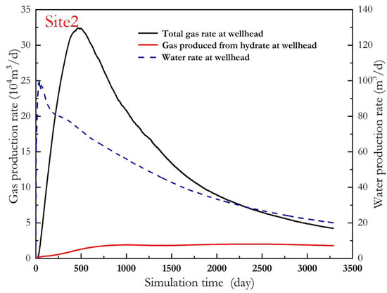 Variation of total gas water at the wellhead, gas produced from hydrate at the wellhead, and water production with time at Site 2.