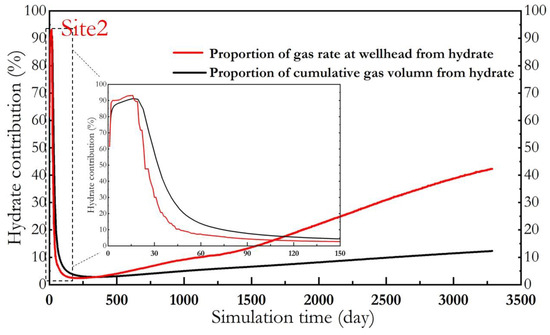 Instantaneous proportion of gas rate at the wellhead from hydrate and the cumulative proportion of gas at the wellhead from hydrate at Site 2.