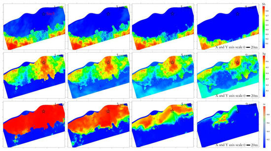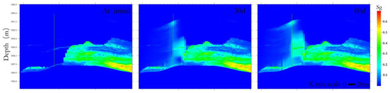Site 2 is also in the hydrate zone. However, the hydrate saturation around Site 2 is between 0.2 and 0.6, lower than that of Site 1. The initial effective permeability is higher, which is conducive to pore water discharge and pressure drop diffusion. The biggest difference is that Site 2 is close to the transition zone. Setting up this site aims to accelerate the hydrate dissociation rate through a large production pressure differential and communicate with free gas in the transition zone as soon as possible. It aims to drive the effective dissociation of hydrate in the incoming gas direction through the favorable element that the gas temperature is higher than that of the hydrate zone. The total gas rate, gas rate from hydrate, and water production rate at Site 2 are shown in Figure 10. As seen from it, the total gas production rate climbed rapidly in the first 500 days and reached 32.5 × 104 m3/d. It is impossible to support such a large production rate just with hydrate. The producer well at Site 2 effectively connects the free gas in the transition zone. The gas rate produced by hydrate at the wellhead is also growing in the early stage and is close to 1.3 × 104 m3/d by 500 days. Figure 11 shows the instantaneous proportion of gas rate at the wellhead from hydrate and the cumulative proportion of gas at the wellhead from hydrate. When the well opens, the instantaneous proportion of gas rate at the wellhead from hydrate cannot reach 100% because part of the well section is accompanied by the mixed hydrate–gas–water layer. With the great pressure differential and hydrate dissociation, it begins to increase and reaches a peak of 93%. After that, it starts to decrease rapidly, which means the free gas in the transition zone has reached the producer well. Correspondingly, the water rate also grows rapidly during this period, approaching 100 m3/d, which is due to gas invasion into the hydrate zone and elastic drive to water relying on the high volume coefficient of gas. However, the high water rate cannot last long, which also implies that the free gas has established a continuous and stable flow channel to the well. Figure 12 shows the change in gas saturation distribution around the well at the initial point. The gas from the transition zone invades rapidly through the mixed hydrate–gas–water layer, displacing pore water along the way. The gas distribution on the 60th day validates the above point, by which time the gas from the transition zone has successfully established an efficient flow channel to the well. The instantaneous proportion of gas rate at the wellhead from hydrate has dropped rapidly to 7%. Since then, the main driver of reservoir pressure drop has changed from water drainage to gas discharge. The shrinkage in this ratio is not a disadvantage. The expected gas invasion has significantly increased the gas production rate, making Site 2 commercially exploitable. At the end of the simulation, the wellhead cumulative gas production volume is 4.51 × 108 m3. The cumulative gas volume from hydrate contribution is 5552 × 104 m3, accounting for 12.3%. Under the same production pressure differential, the cumulative hydrate contribution of gas in 9 years at Site 2 is much better than that at Site 1, almost 7.7 times.