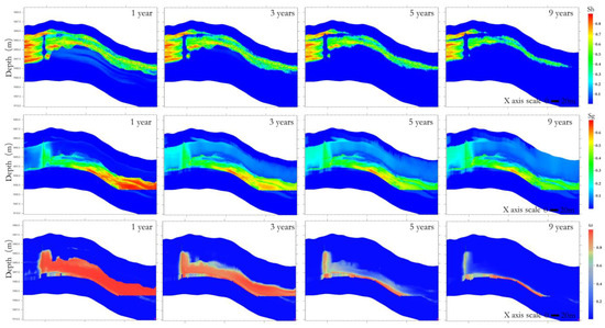 Figure 13 shows the evolution of the hydrate saturation, gas saturation, and the proportion of free gas in the pore ω during extraction. Initially, only hydrate near the well can dissociate. It is noteworthy that the hydrate on the invasion route of gas can dissociate quickly. It is due to the elastic drive of gas, which accelerates the pressure drop in this zone. Moreover, the temperature of the free gas is higher than that of the hydrate, which provides a valuable heat supply. These are all the original design intentions of Site 2. Another main area of hydrate dissociation is the transition zone. The release of gas in the lower part of the transition zone facilitates pressure diffusion and stimulates the hydrate dissociation. However, the dissociated gas does not seem to support the wellhead gas rate. As can be seen from the gas saturation distribution, the dissociated gas in the transition zone increases the gas saturation, but only a small amount of it can flow directly to the well. The distribution of gas content shows that the gas from hydrate dissociation in the transition zone mainly goes to the lower part of the transition zone, filling the space originally occupied by the free gas. It means that the effective gas supply of hydrate at Site 2 mainly comes from the near-well formations. The producer well at Site 2 has weak control over the gas from hydrate dissociation in the transition zone. The free gas content decreases significantly in the later period, corresponding to the shrinkage of the overall gas production rate.