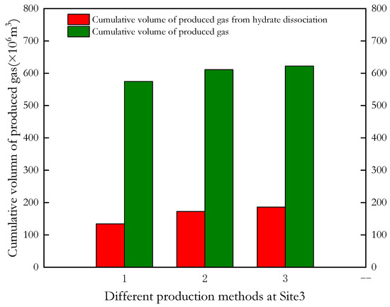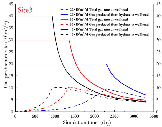 Unlike the gas production from hydrate dissociation, free gas does not need to break the equilibrium condition and complex kinetic reactions. A high and stable gas rate can be obtained as long as the stratum energy is sufficient and the permeability is high. For the underlying free gas with high gas saturation, porosity, and permeability, the relationship between the stable production rate and duration depends on the controllable storage volume of the single well. For the complex hydrate system in the QDNB, what needs to be additionally evaluated in this paper is the effect of different production regimes on hydrate dissociation. It is obvious that the higher the expected gas rate, the shorter the stable production duration. Figure 14 shows the total gas and gas rates from hydrate at the wellhead under different conditions of expected gas rates. For Site 3, the production rate 20 × 104 m3/d can be maintained for 2389 days, 30 × 104 m3/d can be maintained for 1350 days, and 40 × 104 m3/d can be maintained only for 865 days. In order to maintain a stable gas rate, it is inevitable to continuously reduce the bottom-hole pressure and make the pressure differential larger. The hydrate dissociation rate accelerates, thus providing additional capacity replenishment in the stable production stage, where the free gas supply is the main source. From Figure 14, it can be seen that the wellhead gas rate from hydrate reaches its peak at the end of stable production, which prolongs the stable production duration to a certain extent. The higher the stable production rate, the lower the total gas rate at the end of the simulation, with the final gas rate reducing to 6.04 × 104 m3/d for 20 × 104 m3/d and 4.32 × 104 m3/d for 40 × 104 m3/d.