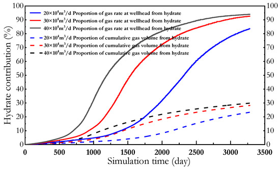 Figure 15 shows the cumulative gas volume and gas from hydrate dissociation at the wellhead. It can be seen that the higher the set gas production rate, the more gas can be produced from Site 3. The increment is not significant. Compared with the stable production rate of 20 × 104 m3/d, the cumulative gas production volume of 40 × 104 m3/d for 9 years is 6.22 × 108 m3, with a slight increase of 0.48 × 108 m3. It is worth noting that the increment almost completely comes from hydrate contribution. It can be inferred that depressurization speed has little effect on the recovery of free gas but much on hydrate dissociation. The larger the initial gas rate, the faster the depressurization speed, the more intense the hydrate dissociation, and the higher the proportion of gas rate and cumulative gas volume from hydrate. Figure 16 shows the instantaneous proportion of gas rate at the wellhead from hydrate and the proportion of cumulative gas volume from hydrate. As shown in Figure 16, the contribution from hydrate is greatly improved. The proportions of cumulative gas volume from hydrate with different stable production rates reach 23.3%, 28.2%, and 29.9%, respectively. The ultimate proportions of gas rate from hydrate reach 83.6%, 92.6%, and 94%, respectively. It also implies the depletion of controllable reserves of free gas at Site 3.
