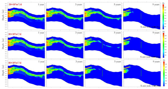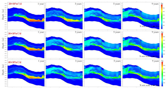 The evolution of hydrate saturation at Site 3 with different stable production rates is shown in Figure 17. The producer well at Site 3 strengthens the control of hydrate in the transition zone. The rapid recovery of free gas becomes an important driving force for hydrate dissociation in the upper part of the transition zone. When the pressure drop is transferred to the hydrate zone, the dissociation occurs from the intersection with the transition zone to the deeper part of the hydrate reservoir. The issue of concern is whether the gas produced from hydrate can be efficiently transported into the well at a distance. Figure 18 shows the evolution of gas saturation with different production rates. The gas saturation in the lower part of the transition zone drops gradually over time. The upper part of the transition zone still has a “water blockage” effect after hydrate dissociation, which hinders the gas produced by the hydrate from flowing into the well quickly.