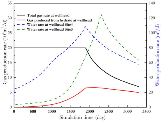 There is a 2 m thick water layer in the lower part of Site 4. In the development of conventional bottom water reservoirs, due to the deformation of pressure potential, it is easy to cause bottom water invasion. In order to avoid excessive water production, the penetrated layer is set from the hydrate layer to the middle of the gas layer. If the bottom water intrudes into the producer well, it will cause a production decline. To relieve the bottom water invasion, the lower stable production target (20 × 104 m3/d) is adopted. Figure 19 shows the variation in total gas water at the wellhead, gas produced from hydrate at the wellhead, and water production with time at Site 4. The cumulative water volume is 2.21 × 104 m3, which increased by 40.3% compared to the same regime at Site 3 (1.57 × 104 m3). The stable production time is shortened to 1857 days, more than 500 days less. The hydrate dissociation performance is also weakened, with the peak rate of the wellhead gas rate from hydrate reaching only 6.56 × 104 m3.