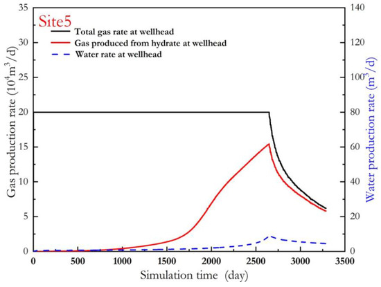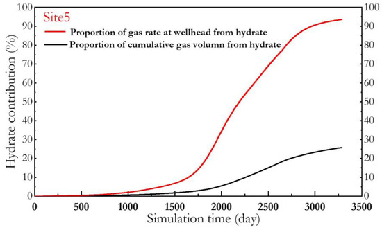 Site 5 is located in the center of the gas zone and is developed with a stable gas rate. Figure 20 shows the total gas rate, the gas rate at the wellhead from hydrate, and the water rate with a stable gas rate of 20 × 104 m3/d. The stable production duration at Site 5 increases slightly to 2645 days. The development strategy of Site 5 is to reduce the reservoir pressure by extracting the free gas in the center of the whole reservoir. Initially, hydrate plays an unimportant role. The gas rate at the wellhead from hydrate rises very slowly to only 1.38 × 104 m3/d on the 1500th day, much lower than other sites. After the recovery of free gas is nearly completed, the gas rate from hydrate begins to rise significantly. At the end of stable production, the hydrate contribution rate reaches 15.3 × 104 m3/d, accounting for nearly 77% (Figure 21). At this point, the free gas recovery is close to the peak. The depletion of the formation energy leads to a decline in the total gas rate. The gas production is dominated gradually by the hydrate dissociation. It is worth noting that there is little water coming out from this site because the formation near the well has a low water saturation and a perfect gas flow channel. In summary, the cumulative gas production volume from Site 5 is 5.94 × 108 m3, which is 3% higher than that of Site 3 under the same method.