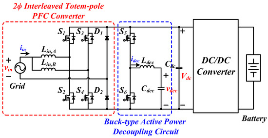 Currently, nations around the world are strongly supporting research activities to reduce dependence on fossil fuels and reduce dangerous air pollutants due to abnormal climate change, i.e., global warming [1]. The biggest of these changes is the replacement of internal combustion engine vehicles with electric vehicles (EVs), which increase energy conversion efficiency and reduce greenhouse gas emissions. Therefore, as the demand for EVs increases, a significant amount of related research is being conducted. The EV charging system field aims to secure faster charging times and longer driving mileages for user convenience. The key research topics in the charging field are high power density and high efficiency [2,3,4,5]. Achieving high power density is important because it allows the driving mileage to be increased by reducing the size of the power conversion system (PCS) and mounting more batteries. On-board chargers (OBCs) are vital components of EVs that are responsible for efficient charging. A typical single-phase OBC consists of a power factor correction (PFC) converter that increases the power factor and a DC–DC converter that performs electrical isolation and controls battery charging [6,7,8]. In single-phase OBC, the PFC converter controls the AC side input current so that it is in phase with the input voltage; therefore, in addition to the constant average power supplied to the DC load, a low-frequency power ripple of 120 Hz occurs, which degrades performance.