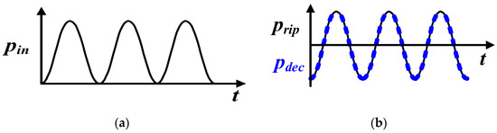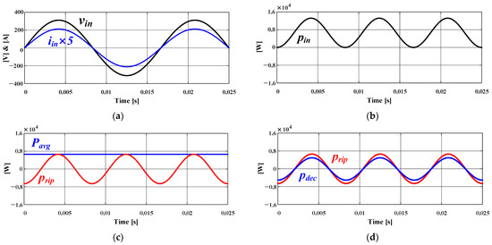 Therefore, in this study, the optimal design of Cdec is proposed under the condition that DC-link has ripple to reduce the volume of the APD circuit. Figure 7 explains the proposed design method and illustrates the process for deriving pdec from input power through input voltage and current. First, assuming unity power factor control on the input side through the PFC converter, it is expressed as shown in Figure 7a, and the voltage, current, and input power can be expressed as follows: