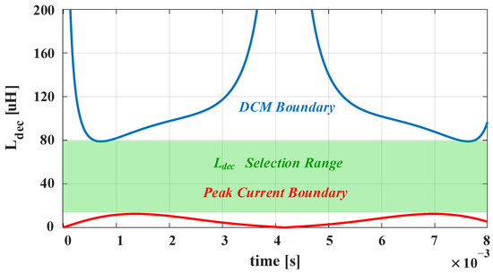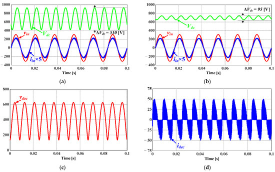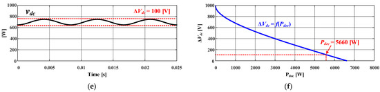 As a result, if the allowable current ripple of the OBC system is designed to be 4 A, the allowable range of DC-link voltage ripple becomes 100 V. As Figure 7f illustrates, the size of Pdec at which the DC-link voltage ripple reaches 100 V is derived as 5.66 kW. Using (10), the capacity of the final Cdec is designed to be 80 μF.