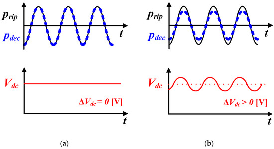 Conventional APD circuit designs set pdec equal to prip, as illustrated in Figure 2. Consequently, any ripple power at the input is eliminated from the APD circuit. To reduce the size of Cdec, which occupies the largest volume in the previously designed APD circuit, one can either decrease pdec or increase the maximum voltage of vdec, as shown in (10). However, the maximum voltage of vdec is limited by the characteristics of the APD circuit and device rating limitations, so reducing pdec is the only possible solution. Nevertheless, when pdec is reduced, as Figure 6 illustrates, prip is not entirely eliminated, resulting in ripples appearing in the output DC-link voltage. These ripples can manifest as a current ripple in the final output of the OBC system.