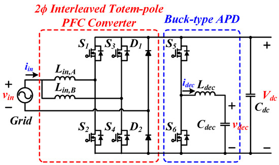 Figure 1 illustrates the PFC converter in a single-phase 6.6 kW OBC with an APD circuit applied. The PFC converter uses a two-phase interleaved totem-pole configuration, while the APD circuit utilizes a buck-type design that can operate independently from the PFC converter. Table 1 presents the design specifications of the PFC converter, which is responsible for input power factor correction and DC-link voltage control. Meanwhile, the APD circuit is in charge of power decoupling control.