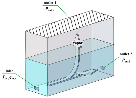 During the working process, the water with a temperature of Tin enters the flash chamber through inlet 1 at a mass flow rate of qm,w. The pressure at vapor outlet 1 (Pout,v), which is lower than the saturation pressure corresponding to Tin, maintains a low pressure in the flash chamber and drives the flash evaporation process. The liquid outlet 2 is set as a pressure boundary (Pout,l) to maintain the liquid level at a certain height, whose magnitude can be calculated from the initial liquid level h and Pout,v.
