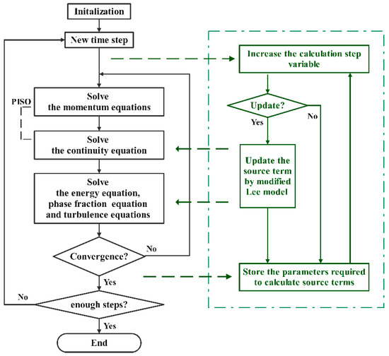 The two-phase distributions and flow states at each transient are obtained by the equations of transient momentum conservation, mass conservation, energy conservation and the phase fraction equation of the VOF method, which are solved sequentially as shown on the left side of the Figure 2. And the phase transition from liquid to vapor is modeled by the modified pressure-driven Lee model, in which the phase transition rate is not calculated from the difference between the local temperature and the fixed saturation temperature, but using the local pressure and temperature, and the source term updates are controlled to ensure the convergence of calculations, as shown on the right side of the Figure 2.