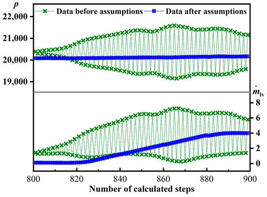 In order to make the calculation have a better stability, an assumption is made in this paper that the local pressure does not change in a certain period of time. This assumption effectively prevents the divergence in the computation and can suppress the phenomenon of numerical oscillations that arise at certain times, as shown in Figure 3, which monitors the different variations of pressure and phase change rate with time at a certain location before and after the application of the assumptions.