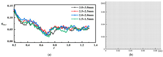The mass flow rate of vapor qm,v and the average temperature of the outlet water Tout were compared for different grids. The minimum sizes of four grids are 3.0 mm, 2.5 mm, 2.0 mm and 1.5 mm, corresponding to the number of grids 154,845, 224,000, 350,000 and 62,0712, respectively. Over the calculated time (26,000 steps, corresponding to 0~1.3 s), the mass rate of vapor generation shows the same trend and eventually tends to the same stable value as reflected in Figure 5a. In addition, the results in Table 2 show that the computational results for the case of the mesh with 2 mm edge are already almost identical to the results of the 1.5 mm mesh (the errors of qm,v and Tout both occur after the third decimal place). Based on these results and taking into account the computational time, the mesh with 2.0 mm edge was selected for the subsequent numerical simulations. The local structure of the mesh is shown in Figure 5b.