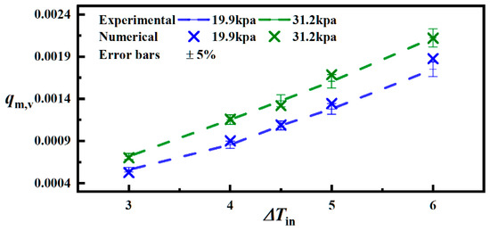 Ten sets of numerical simulations were conducted to fine-tune the time relaxation parameters, and the final values of c and the comparison between numerical simulation results and experimental results are shown in Figure 6 and Figure 7 below. The time relaxation factor takes values from 0.195 to 0.43 (Pout,v = 19.9 kPa, Tin = 3–6 K) and from 0.31 to 0.92 (Pout,v = 31.2 kPa, Tin = 3–6 K) as the superheat increases.