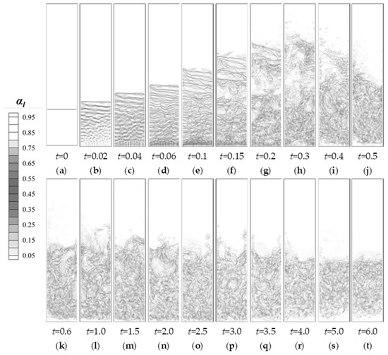 The two-phase distributions of flash evaporation over time (0~6 s): (a)~(t) results at different times.