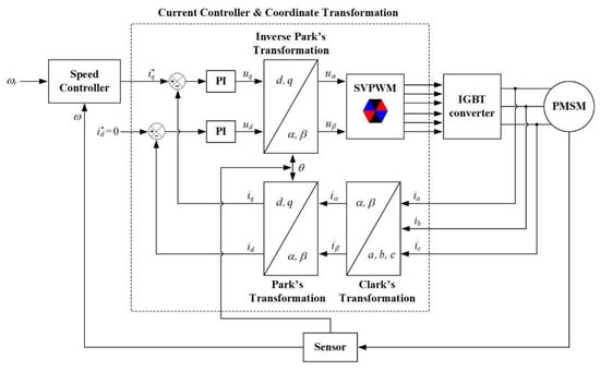In the above expressions, G = (3/2)npφf is the torque constant, np is the number of pole pairs, φf is the flux linkage, J is the moment of inertia, B is the viscous damping coefficient, and id, iq, ud, and uq are the d- and q-axis currents and voltages, respectively. Here, Rs and L are the resistance and inductance of the stator, TL is the load torque of the motor, and the speed ω is the control target. In this work, a control method for surface-mounted PMSM is developed without considering the effect of saliency. The block diagram of a field-oriented control (FOC) variable speed control is shown in Figure 1. Because the electric current that creates a magnetic field will be set to zero, the model does not have a coupling effect between speed and current. As a result, the d- and q-axis inductances of PMSM are set to be equal to each other (L = Ld = Lq). The model of (1) can thus be simplified into the following system of differential equations: