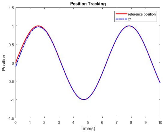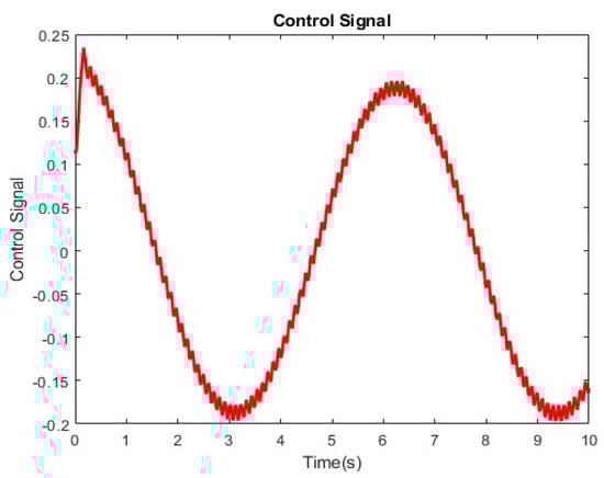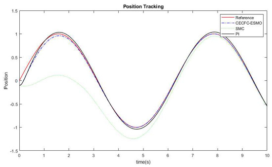 Figure 4 and Figure 5 depict the application of the proposed controller CECFSMC-ESMO in the tracking of the sinusoid reference Hz. As is seen, the closed-loop response exhibits a good ability in the tracking of the reference signal, even under the presence of disturbance, with no steady state errors within a short, fixed time of 2 s. This result is consistent with the control input seen in Figure 6, where the input signal approaches a typical sinusoidal signal after 2 s, albeit with a little chattering. Note that it is also possible to reduce this chattering further in the real-world implementation of the proposed controller with the use of the signr function introduced in [42]. Nevertheless, the closed-loop system is demonstrated to be robust, with a proper convergence rate.
