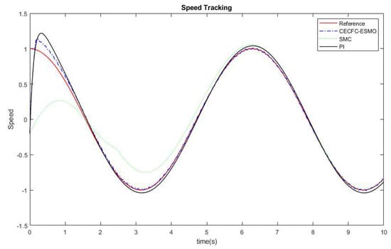 Figure 10 and Figure 11 depict the comparison between the PI controller, the conventional SMC, and the proposed controller scheme CECFSMC-ESMO. As is seen, the PI controller exhibits good tracking for both position and speed. However, it is important to note that a persistent steady-state error persists due to the influence of the generated disturbances. The conventional SMC has quite a poor response at the beginning of the simulation, only being able to track the reference after some 8 s. This is simply because although SMC is known to persist against disturbances, the basic reaching law simply cannot cope with the high frequency content of the disturbance. Note that before the attainment of the reaching time , the controller takes into consideration the observer variable, resulting in the generation of the overall control signal, as specified in (52). Even though the observer successfully estimates disturbances within a finite time of less than one second, there may still be some residual errors requiring mitigation by the CECFSMC. Consequently, this extends the convergence time to approximately 2 s. Note also that although this time could be made shorter by the increment of the parameters and in theory, as discussed in Remark 2, choosing these parameters at too high a value could exacerbate chattering, which would result in detrimental effects on the PMSM, incurring substantial costs in industrial settings.