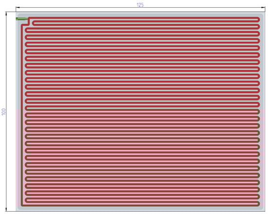 Taking these considerations into account, a channel cross-section of 1 × 1 mm² was finally chosen. In our previous work and together with acetone as a working fluid, this channel cross-section proved to be large enough to not cause a noticeable loss in heat transfer performance due to increased hydraulic resistance [13]. We also note that this cross-section is well below the maximum diameter as defined by the bond criterion ( = 3.17 mm under normal gravity at 300 K [7]). The channels were closely spaced and covered a significant amount of the available space on the PHP without significant channel-free margins, allowing 54 channels (27 turns) to be accommodated in a relatively small total PHP area of 125 × 100 mm². The channels were fabricated by milling half-channels of 1.0 × 0.5 mm² into two separate copper plates (high-purity copper, type CW008A) that were later joined by brazing. The resulting channel structure of the fabricated PHP is shown in Figure 1. The total thickness of this PHP is 6 mm (we note that this relatively high thickness was chosen to prevent warping during the brazing process). For filling, a copper tube was attached to the PHP. Acetone was used as a working fluid. The choice of the working fluid is based on previous literature, particularly the summary given in ref. [14]. Compared to other candidates, acetone has a high gradient of vapor pressure vs. temperature, a low dynamic viscosity, and a low latent heat. All of these characteristics are helpful for starting and sustaining the pulsating fluid motion in the PHP [15]. The filling was conducted at a base pressure in the range of 10−4 mbar measured at the inlet of the mentioned filling tube (not in the PHP itself). The fluid was thoroughly degassed prior to filling. The resulting filling ratio was 54%.