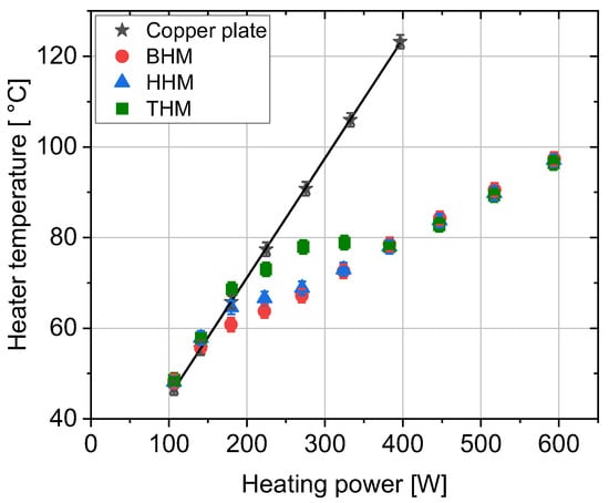 Heater temperature in relation to heating power for different PHP orientations (BHM, HHM, and THM) for a condenser length of 60 mm. Results obtained on a solid copper plate of the same dimensions serve as a bias for comparison. Black solid line: linear fit of heater temperature in relation to heating power on solid copper plate.