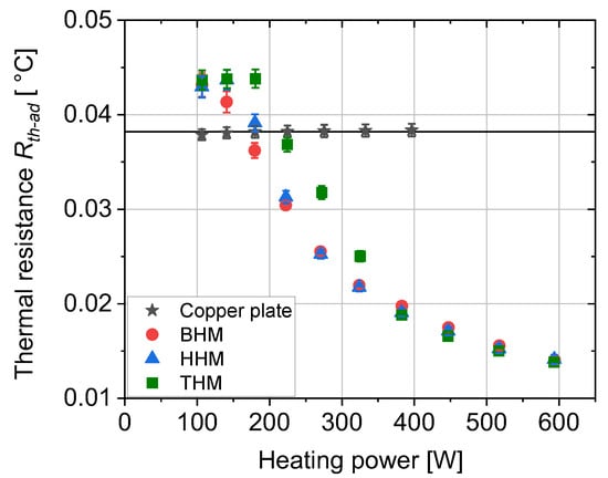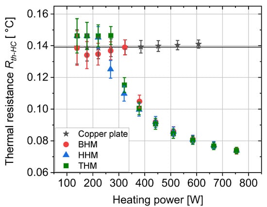 The heater temperature and the thermal resistance in the adiabatic zone for all orientations and in dependence on heating power are shown in Figure 4 and Figure 5. For comparison, heater temperatures and for a copper plate with the same dimensions as the PHP are shown as well. As soon as the PHP activated, the heater temperatures and thermal resistances were clearly lower compared to the copper plate. Note that at 383 W and above, the PHP yielded nearly the same performance in all orientations, even in THM. It is expected that even at the maximum heat load of approximately 600 W in this experiment, the PHP will still be well below the upper limit before dryout occurs: The overall trend in thermal resistance of any heat pipe is characterized by a first phase where the thermal resistance decreases with increasing heating power due to higher fluidic activity until a plateau is reached. When the limits of a heat pipe defined by a dryout condition (based on the used working fluid and the filling ratio) are reached, the thermal resistance rises again, and the heater temperature starts to “run away.” Particularly PHPs with insufficient filling ratios are prone to this phenomenon, see, e.g., [9,19].