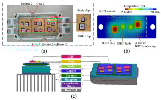 An insulated-gate bipolar transistor (IGBT) is a power semiconductor device with three terminals that serves as an electronic switch in high-power applications such as variable-frequency drives, electric vehicles, trains, variable-speed refrigerators, lamp ballasts, arc-welding machines, and air conditioners [17]. Figure 3a presents an actual example of an IGBT module (Infineon FF225R17ME4), which consists of three sub-modules with diagonally arranged diodes and IGBT chips. The temperature limits for IGBT modules range from 125 °C to 150 °C, depending on the rated voltage [18]. To ensure efficient heat dissipation, an air-cooled heat sink equipped with multiple intermediate layers of different materials (as shown in Figure 3c) is employed.