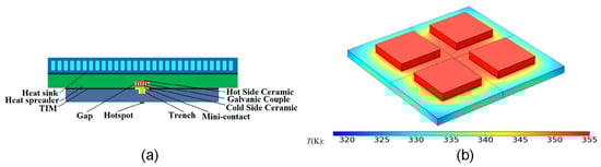 LED package. (a,b) array arrangement of LED chips and layer structure [15]; (c) temperature distribution on the surface of a microchannel heat sink [16]. Reprinted/adapted with permission from Refs. [15,16], October 2023, Elsevier.