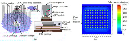Figure 5a shows the operational principle of an HCPV system. Incident sunlight is reflected by the non-imaging dish concentrator to the crossed compound parabolic concentrator (CCPC) lens array, which is composed of 8 × 10 CPV cells. The detailed structure of a single CCPC lens is depicted in the right part of Figure 5a. The CPV module is affixed to a water-cooled heat sink via Artic Silver Adhesive. Figure 5b presents the solar flux contour on such CPV cells array, displaying multiple peak profiles reaching a maximum of 2.940 106 Wm−2. This non-uniform distribution of solar flux inevitably leads to heterogeneous heat generation and large temperature gradients on the CPV board. Numerous studies have highlighted the consequences of CPV cells exposed to high and non-uniform solar concentration ratios. For instance, the open circuit voltage of CPV cells is inversely proportional to their temperature, thereby reducing the power conversion efficiency [33]. The effects of high temperature become particularly significant at concentration levels approaching 1000 suns, even for a brief duration of a few milliseconds [33].