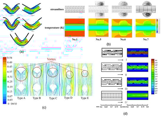 Local flow disturbance generated by different channel structuration for heat transfer enhancement. (a) zigzag and wary channel [44]; (b) cavity channel [45]; (c) ribs on the bottom walls [46]; (d) ribs on the side walls [47]. Reprinted/adapted with permission from Refs. [44,46], October 2023, Elsevier.