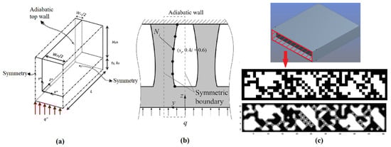 TO of heat sink cross-sections has been explored in two studies to the best of the authors’ knowledge. Dokken and Fronk [68] discretized the heat sink cross-section into bit arrays (Figure 8c) and used a micro-GA to generate optimal shapes that minimize the system’s entropy generation rate. Lee et al. [76] developed a TO method to minimize the thermal resistance under the constraint of fixed pumping power. This approach enables the design of lighter heat sinks with higher thermal performance for practical applications. It is important to note that both studies address the problem of localized (multiple) heat sources rather than simplified uniform heating surfaces, highlighting the superiority of TO in treating electronic cooling problems under multiple-peak heat flux. However, this approach differs from the TO of the global channel configuration to be discussed in Section 3.2.5, as it maintains the same optimized cross-section topology throughout the channel length (flow direction). Actually, this optimization approach focuses on the mass flow distribution inside the heat sink without presetting parallel channels, providing prospects for tailoring flow distribution to address multiple-peak heat flux cases (cf. Section 3.2.3).