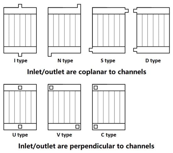 Studies have investigated the effect of flow inlet angle between the inlet port and parallel channels [95], as well as the locations of inlet/outlet positions [96,97] (cf. Figure 10). Kumar and Singh [94] reported that an I-type flow arrangement provided better thermal performance for uniform heating compared to a D-type heat sink having a more uniform flow distribution. Chen et al. [98] reported the best cooling performance of an air-cooled battery thermal management system with the inlet and outlet located in the middle of the plenums.