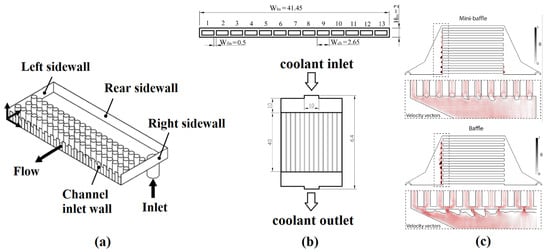 Additionally, the design and shape of headers have been examined by Manikanda Kumaran et al. [96], with triangular inlet headers and trapezoidal outlet headers shown to provide better flow uniformity. Many other novel header designs [96,100,101,102] have also been proposed and tested, as summarized in the review paper by Ghani et al. [54]. Besides modifying the inlet/outlet header shapes, studies have been performed on adding obstacles inside the header to address the issue of flow maldistribution, including staggered pin-fin array (Figure 11a) [103], non-uniform-sized mini-inlet baffle (Figure 11b) [104,105], thin layers of porous media [106], and optimized manifold configurations (Figure 11c) [107].