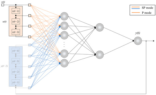 This study utilized the nonlinear autoregressive with exogenous input (NARX) network as the prediction model for the day-ahead hourly SC* and BIPV power output. Compared to other models, this model has yielded better performance for time series problems [36,37,38]. Furthermore, compared to other time series models, the model can adopt new inputs or disturbances [39,40,41,42]. Equation (1) describes the general mathematical expression of the NARX model [43,44]: