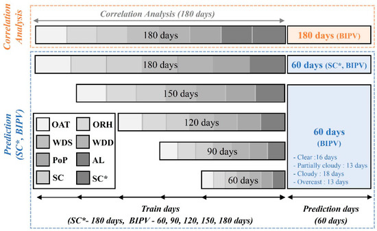 Regarding the quality of the past data, the data processing managed the missing data and outliers. Linear interpolation converted 3 hours of past weather forecasted data to an hour. To define the optimized training data set, the model performance for the day-ahead prediction of BIPV power output for 60 days using the weather forecasting indices without SC* was evaluated using different training sets under the same model hyperparameter configurations. Table 8 illustrates the ratio of each daily average sky condition to the potential training size (60, 90, 120, 150, and 180 days).