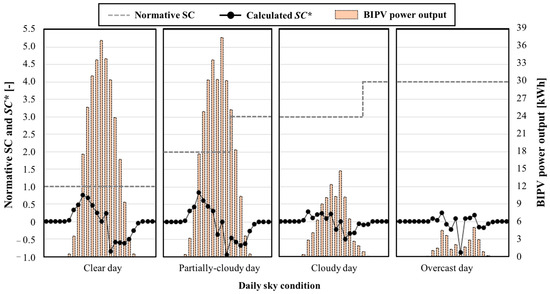 where PV and AL are the hourly power output and the solar altitude angle in the current (t) and the previous time step (t – 1), respectively. The value will be positive when the sky is clear, whereas it will be negative if the current BIPV power output is less than the value of the previous time step until noon. In the afternoon, calculated SC* will have a negative value, but it will be significantly lower when the clouds cast a shadow on the BIPV, as shown in Figure 5. Hourly SC* values are more sensitive to the normative SC from the forecasting service compared to the hourly BIPV power output. On day 2 in Figure 5, the normative SC was constant each time, whereas the BIPV power output was not as steady as the normative sky condition.