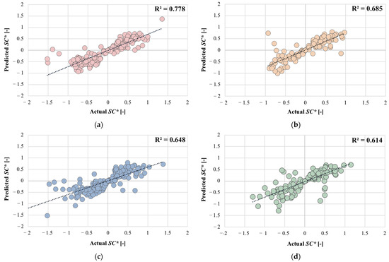Distribution of hourly predicted SC* with NARX network. (a) Clear days (16 days); (b) Partially Cloudy days (13 days); (c) Cloudy days (18 days); (d) Overcast days (13 days).