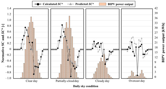 Figure 9 compares the hourly calculated SC* and predicted SC*. As illustrated in the previous section, the calculated SC* is derived from past weather data and BIPV outputs, but the predicted SC* is an output of the NARX model using the solar position and weather forecasting data. For 60 days, the predicted SC* showed a higher value of R2 with the calculated value on Clear (R2 = 0.778) and Partially Cloudy (R2 = 0.685) days. The performance degraded on Cloudy (R2 = 0.648) and Overcast days (R2 = 0.614).