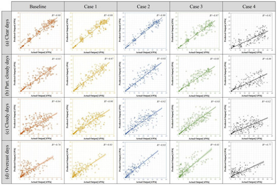 Under Case-2, the model performance was higher than those under other input conditions, as the typical week analysis with the average 60-day MAPE of 15.14% and R2 of 0.95. Compared to Base, this input condition provided the highest accuracy as the MAPE values decreased by 3.21, 1.35, and 4.80% on Clear, Partially Cloudy, and Cloudy days, respectively. The MAPE and R2 on Overcast days were 27.70% and 0.93, corresponding to an increase of 49.30% and 0.18, respectively, compared to that of Base. Compared to [29], which uses only the weather forecast data set, the suggested process can improve the prediction performance by 3.88% in MAPE under Clear days and 52.37% in MAPE under Cloudy days.